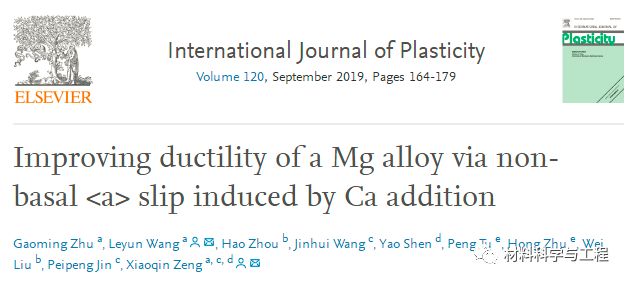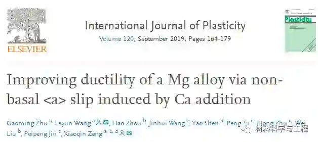 相关成果以“Improving ductility of a Mg alloy via non-basal< a> slip induced by Ca addition”为题发表于国际刊物International Journal of Plasticity(IF=5.800)。该论文第一作者为博士生朱高明,通讯作者为王乐耘特别研究员和曾小勤教授。其他合作者分别来自南京理工大学、青海大学、交大密歇根学院和交大材料学院。该研究得到了国家重点研发计划项目(2016YFB0701203)和国家自然科学基金(51631006和51671127)的资助。