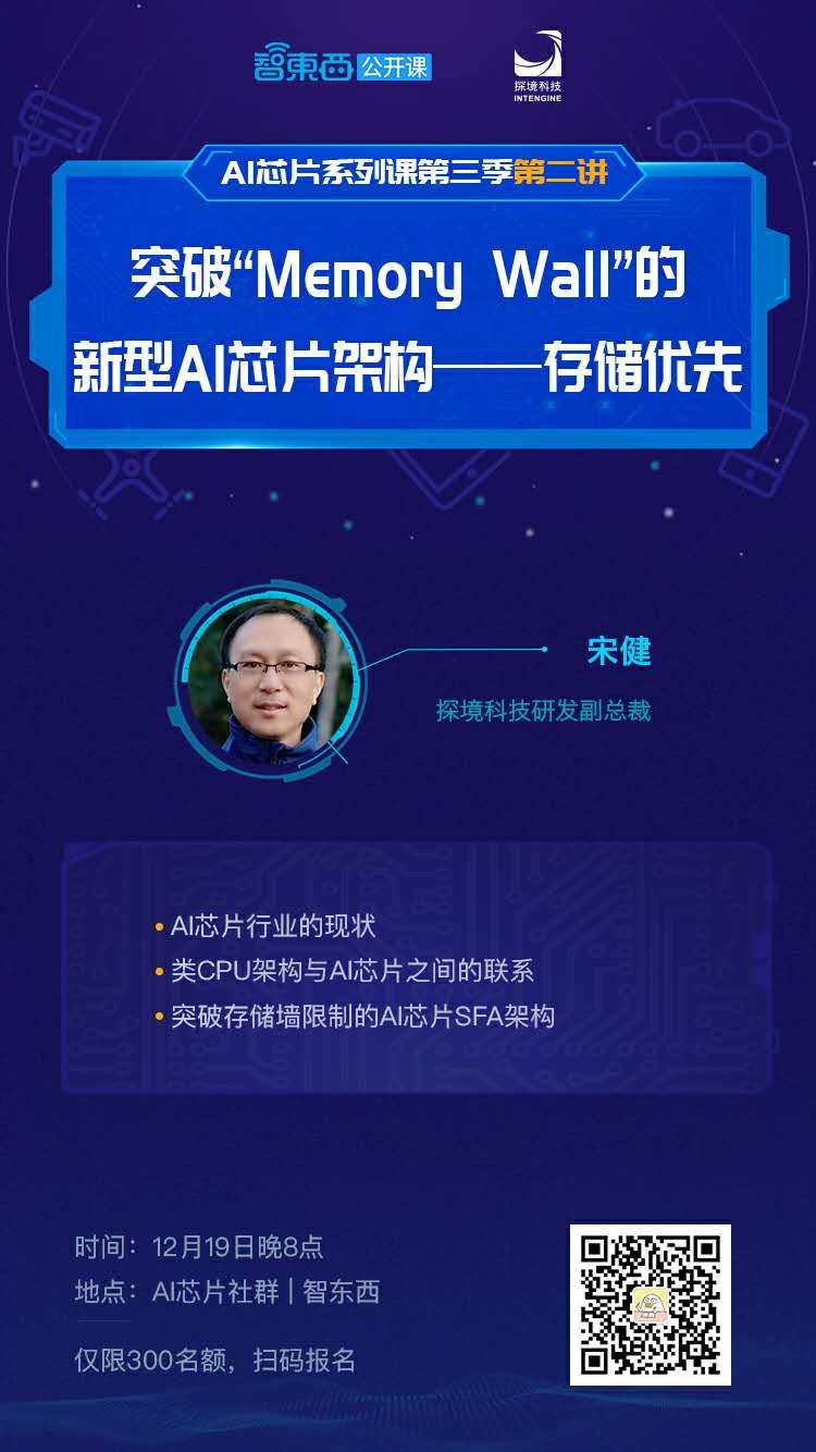 周三晚8点,AI芯片系列课第二讲正式开讲!由探境科技研发副总裁宋健主讲,主题为《突破“Memory Wall”的新型AI芯片架构–存储优先》。感兴趣的小伙伴可以扫码报名!