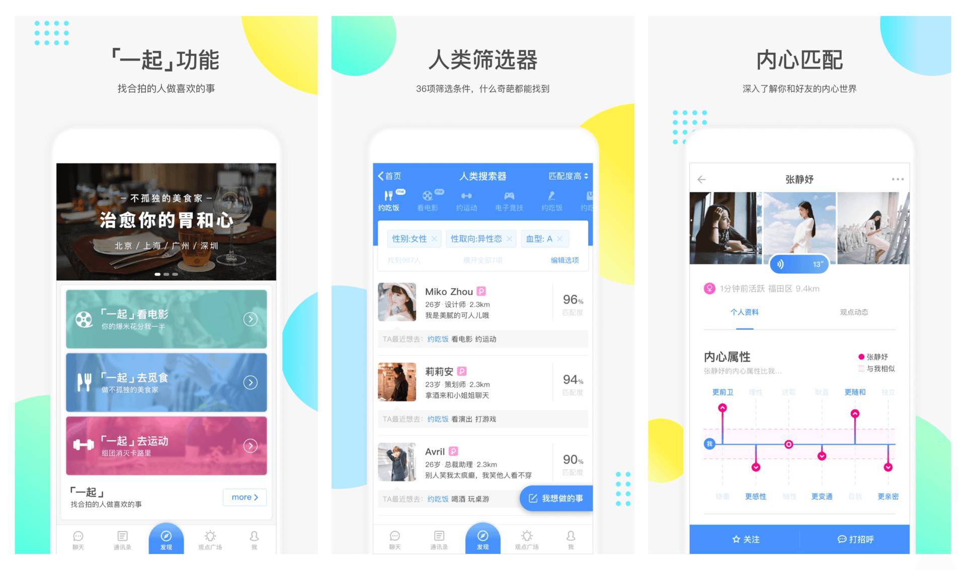 你可以在这里找寻一起觅食,一起看电影,一起做运动健身的人,会针对你的需求进行精准测试,按区配度排列,给你列出合适人选。