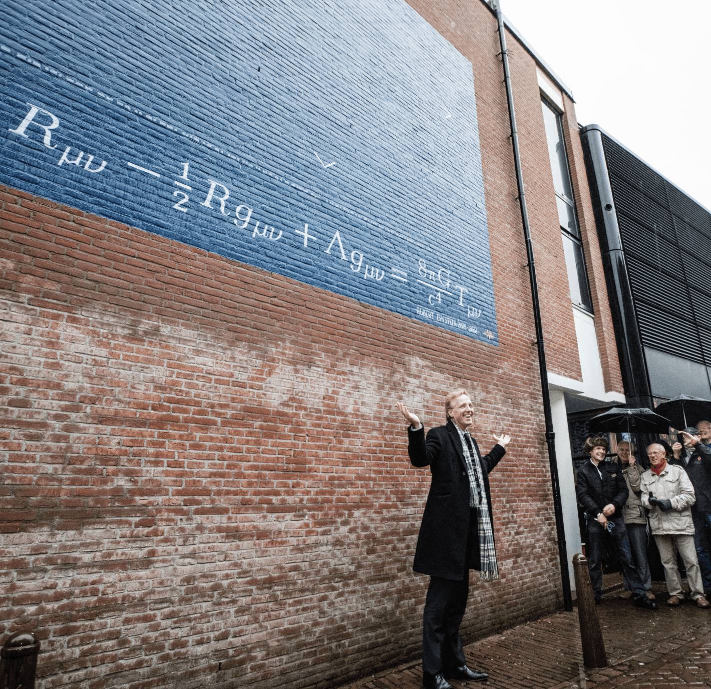 很快,这个想法得到了城市和大学的支持,所需的资金也被迅速批了下来。不久之后,阿姆斯特丹大学的教授兼普林斯顿高等研究院院长 Robbert Dijkgraaf 于2015年11月24日揭幕了第一面墙的公式,即爱因斯坦的场方程: