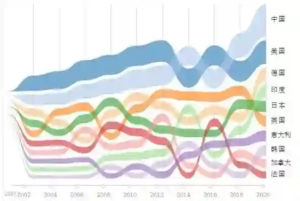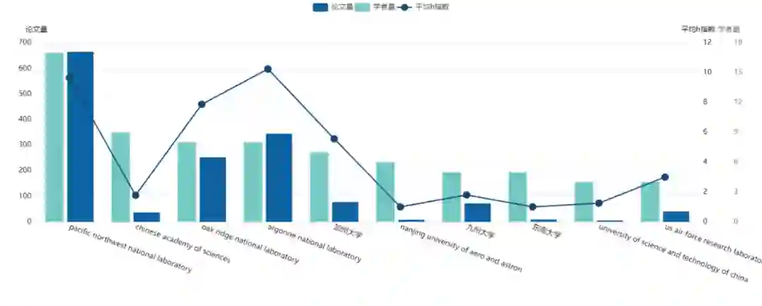 从学者所在机构分布看,高层次学者数量前十的全球机构主要为中国机构所占据,如图6 所示。这反映出中国机构在定向能领域拥有较多的高层次学者资源优势。在该领域学者最多的前 10 机构依次是:Pacific Northwest National Laboratory(美国太平洋西北国家实验室)、中国科学院、Oak Ridge Nationallaboratory(美国橡树岭国家实验室)、Argonne National Laboratory(美国阿贡国家实验室)、University of California(美国加利福尼亚大学)、南京航空航天大学、日本九州大学、东南大学、中国科技大学、Us Air Force Research Laboratory(美国空军研究实验室)。