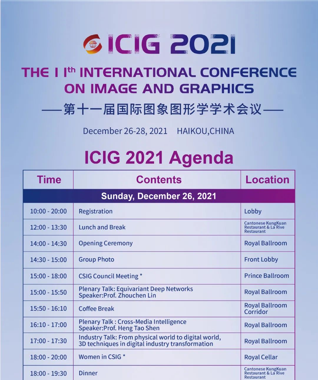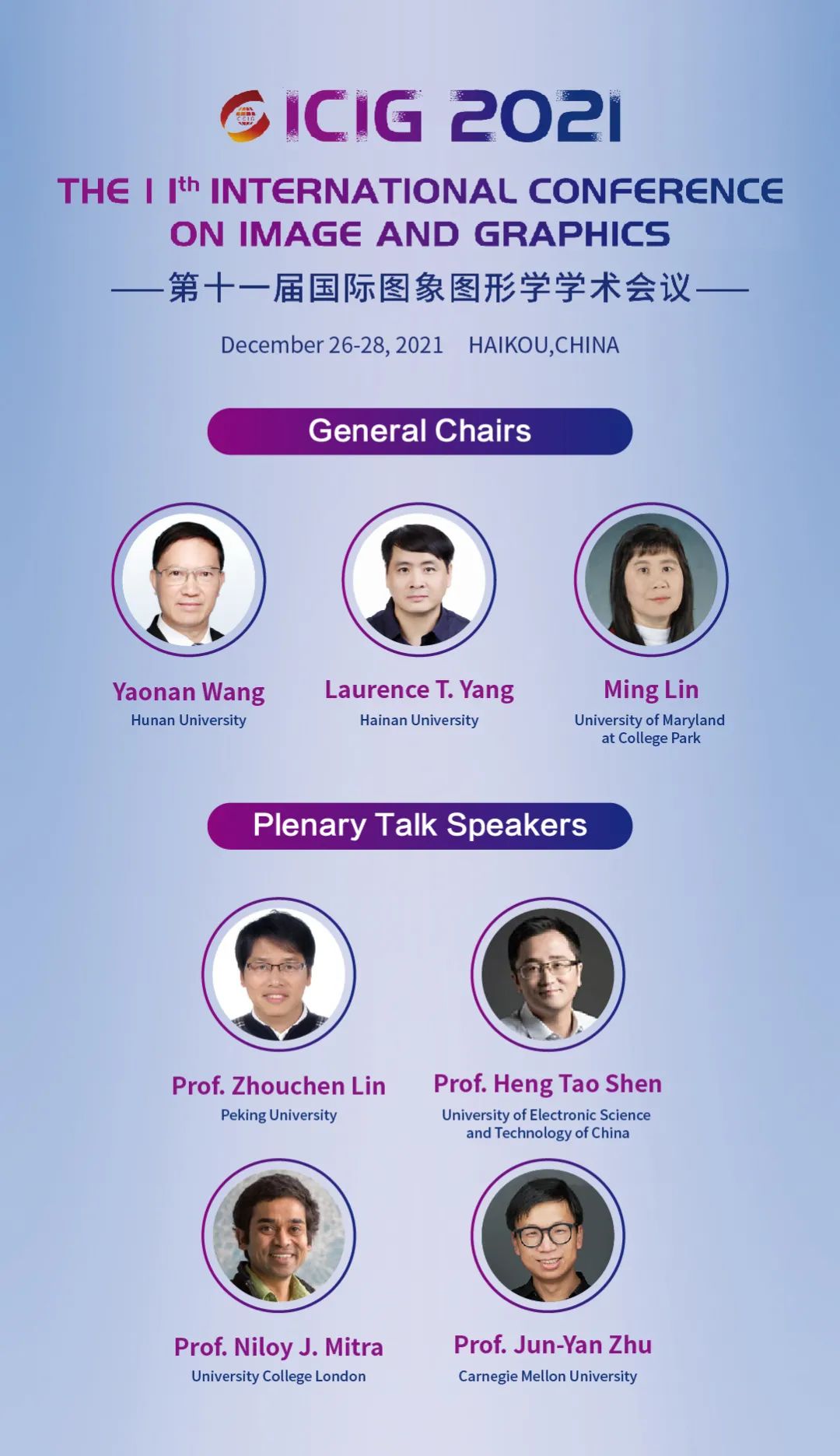 第十一届国际图象图形学学术会议(ICIG 2021)将于2021年12月26-28日在海口举行,会议由中国图象图形学学会主办,海南大学承办,南京理工大学协办。会议聚焦图像、视频及图形处理领域的创新技术,旨在促进创新、创业和交流,诚邀国内外图像图形领域的科技人员参会交流。