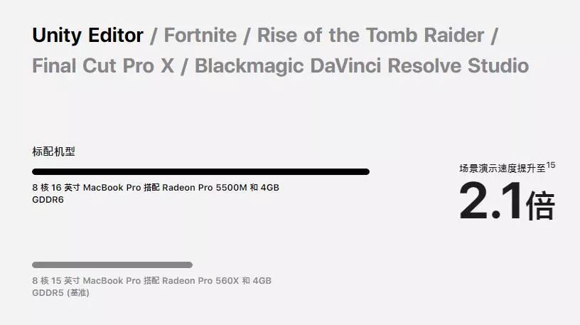 图形处理性能对专业人士至关重要,无论是创作下一个游戏作品、渲染复杂的三维场景,还是为电影大片进行调色。16 英寸 MacBook Pro 配备新的 AMD Radeon Pro 5000M 系列图形处理器,这是首款为专业用户打造的 7 纳米制程移动独立显卡。在 Mac 笔记本电脑上首次可选配 8GB 的 GDDR6 显存,专业用户从此能够比以往更快速地处理需要大量图形处理器资源的任务。用户选择标配图形处理器时,将会实现比上一代标配提升至 2.1 倍的图形处理性能。选择高配图形处理器时,将会实现比上一代高配提升最高可达 80% 的图形处理性能。