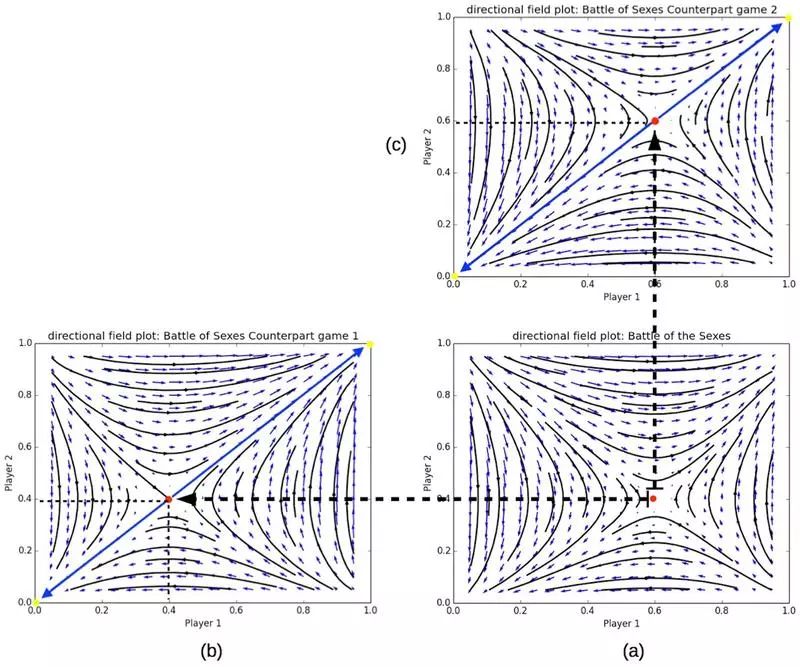 红点代表纳什均衡点。对于非对称博弈 (a),这很容易从两个对称玩家 (b) 和 (c) 的情节中推导出来,在所有的情节中,x 轴对应于玩家 1 选择 opera 的概率,而 y 轴则对应于第二个玩家选择 opera 的概率。