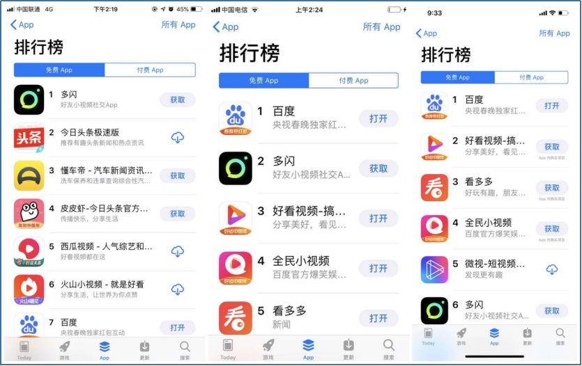 无图无证据,有图有真相。上面左图是除夕节前截图,多闪、头条极速版等头条系APP一路狂飙突进;中间是除夕后,百度春晚豪砸9亿一夜翻身,百度APP、好看视频等多个百度系APP冲入前五;而在最近排行榜上,百度系依旧霸榜,多闪持续下滑而微视悄悄赶上。