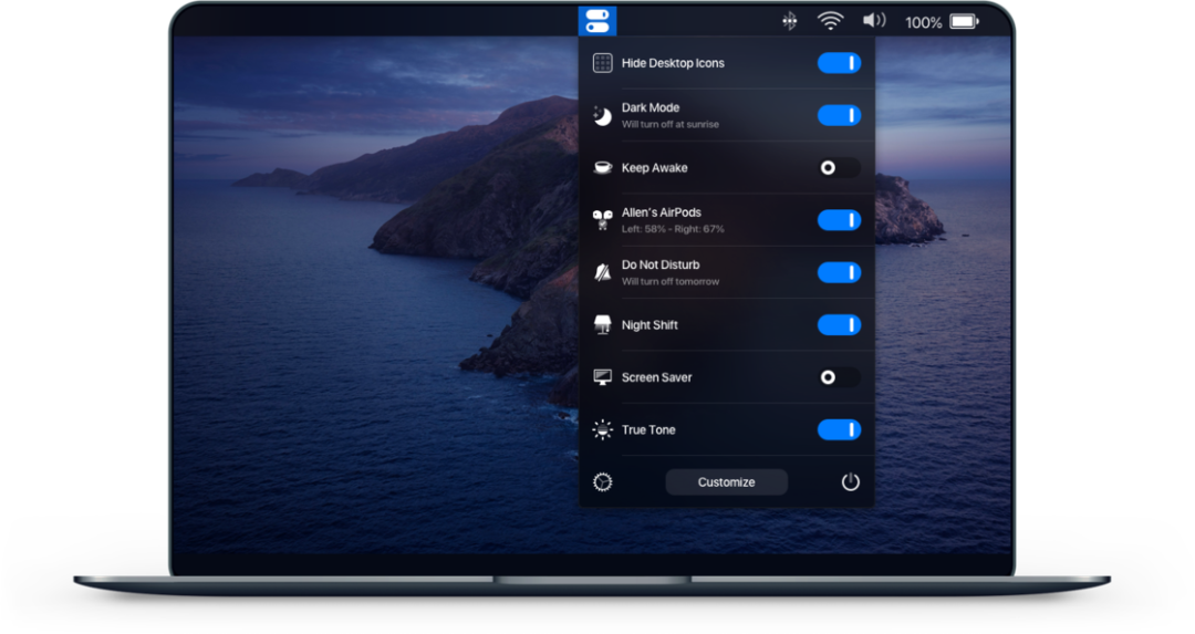 它会常驻在你的菜单栏中,你只需要点击几下,就能做到切换蓝牙耳机、打开或关闭相应的系统功能等动作,不再需要到「系统偏好设置」里东翻西找。