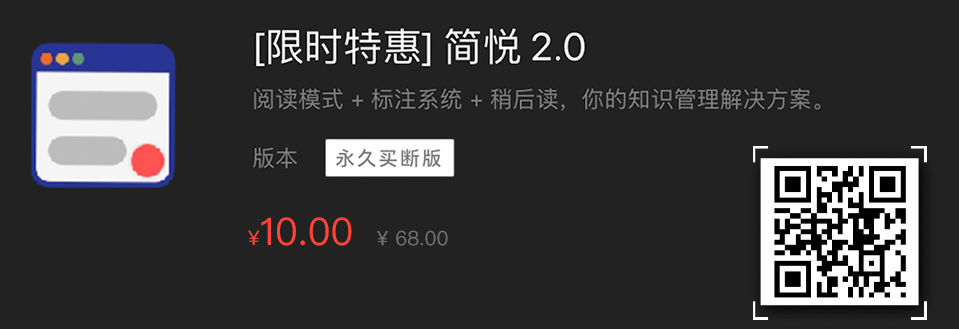 本次双十一活动期间购买简悦可享特惠价 10 元,开发者也表示,之后不会再有低于低于此次活动的价格,如果你有相关需求,现在是你入手简悦的最好时机。