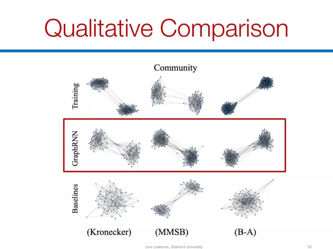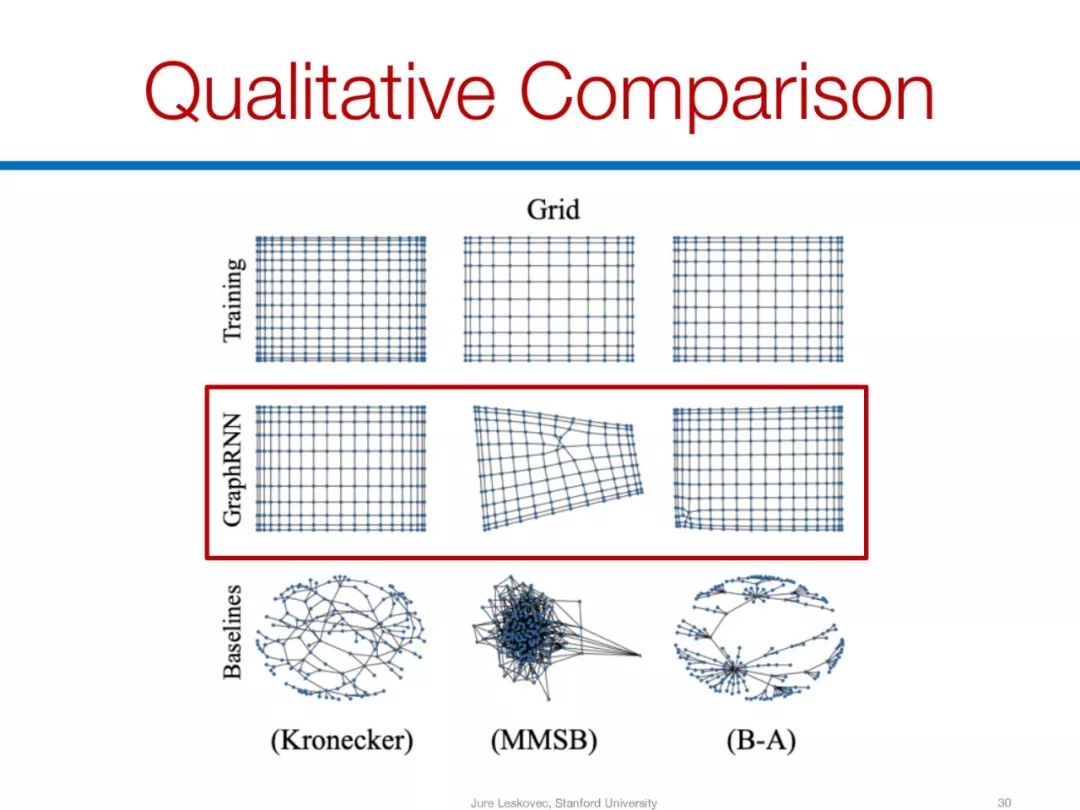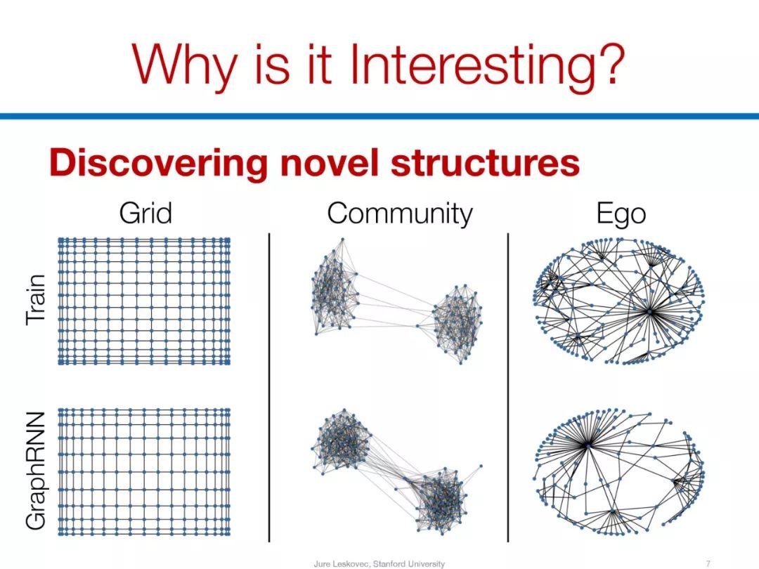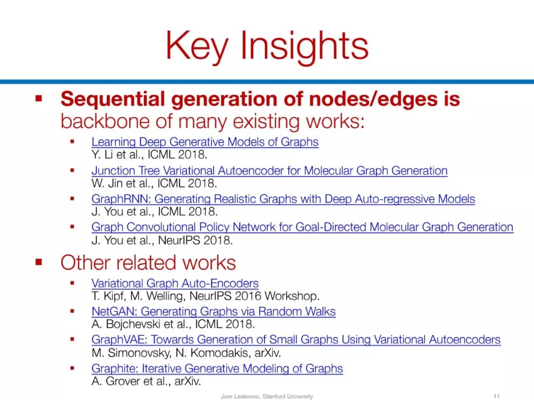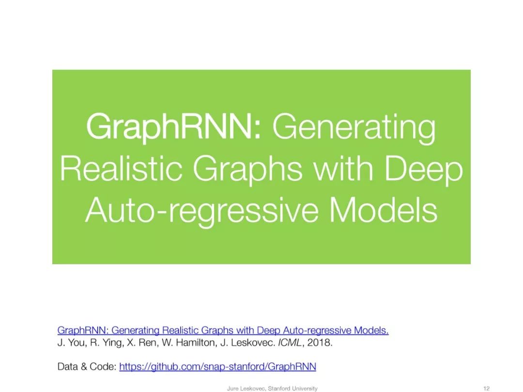 此外,在 ICLR 受邀演讲上,Jure Leskovec 教授还就图深度生成模型做了演讲。在这次演讲中,Jure 阐述了图生成模型的方法和应用,并详细介绍了他的最新成果,GraphRNN 和 Graph Convolutional Policy Network。