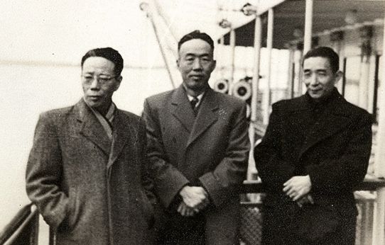 1953年,中国科学院代表团访问前苏联时贝时璋(右)与吕叔湘(左)、赵九章(中)合影