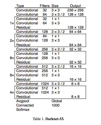 我们使用一个新的网络来执行特征提取。该新网络是用于YOLOv2,Darknet-19的网络和更新的残差网络的混合方法。我们的网络使用连续的3×3和1×1卷积层,但现在也有一些shortcut连接,并且网络的大小显著更大。它有53个卷积层,所以我们称之为...... Darknet-53!