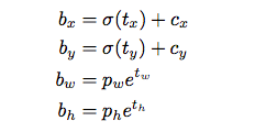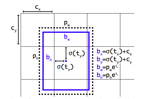 图2: 具有dimension priors和location prediction的边界框。我们预测了框的宽度和高度,作为cluster centroids的偏移量。我们使用sigmoid函数预测相对于滤波器应用位置的边界框的中心坐标。这个图是从YOLO9000论文[13]拿来的。