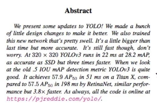 【新智元导读】你肯定很少见到这样的论文,全文像闲聊一样,不愧是YOLO的发明者。物体检测领域的经典论文YOLO(You Only Look Once)的两位作者,华盛顿大学的Joseph Redmon和Ali Farhadi最新提出了YOLO的第三版改进YOLO v3,一系列设计改进,使得新模型性能更好,速度更快。达到相似的性能时,相比SSD,速度提高3倍;相比RetinaNet,速度提高3.8倍。