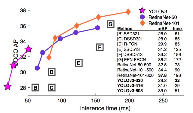 表3:再次,这张图来自论文[7],稍作了调整。这里显示的速度/准确度在mAP上以0.5 IOU度量进行折衷。你可以看到,YOLOv3很厉害,因为它非常高,而且离左轴远。