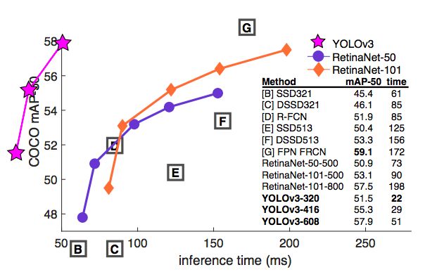 当用AP50指标表示精确度和速度时(见图3),可以看到YOLOv3与其他检测系统相比具有显着的优势。也就是说,YOLOv3更快、而且更好。