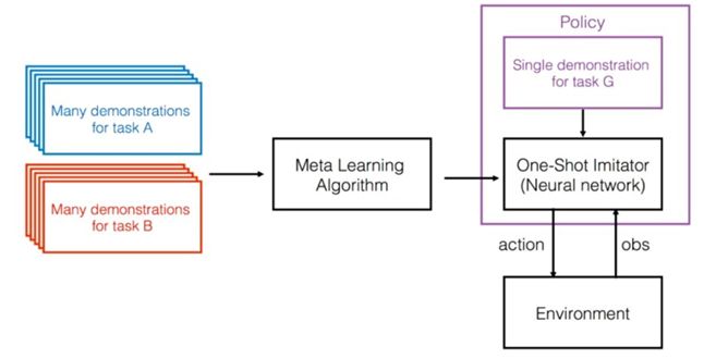 在 2017 年的 NIPS 大会中,Abbeel 和 OpenAI 和加州大学伯克利分校的研究人员通过元学习提出了 One-Shot Visual Imitation Learning viaMeta-Learning,该学习将元学习与一次性学习相结合,该系统只需要观察 1 个演示,然后就可以为新任务产生正确的动作。