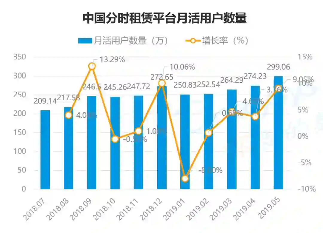 据易观研究显示,分时租赁平台的月活用户增长率已经从2019年初的-8%增长至5月份的9%,用户平均使用时长也有所提升,分时租赁平台正在度过此前押金和平台整合的负面影响。