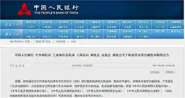 2017年9月4日,中国央行等七部委发布关于防范代币发行(ICO)融资风险公告,认定ICO及其代币为非法集资和传销骗局