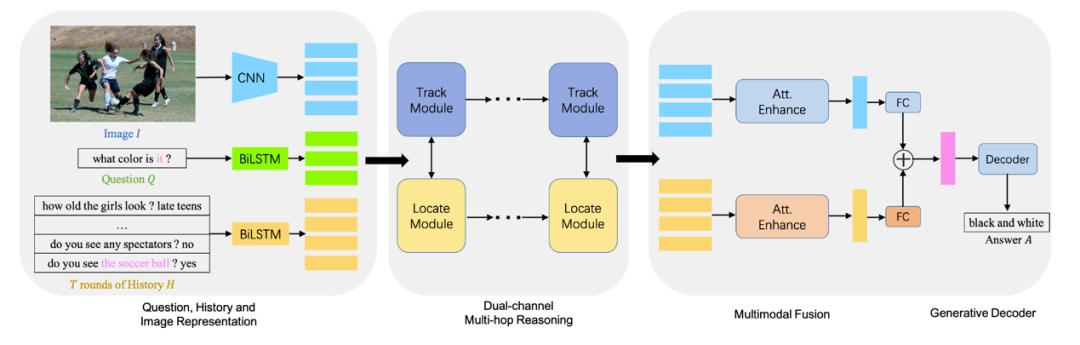 使用CNN和Bi-LSTM分别对视觉模态的图片和文字模态的对话历史及问题,进行特征表示。