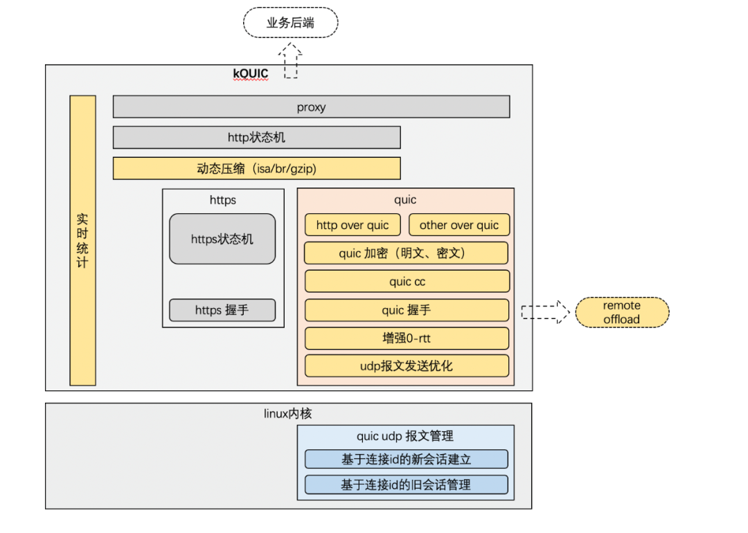 下图为服务端方案整体架构,从Nginx内核集成QUIC协议栈,实现多协议同层接入,到Linux内核优化UDP报文管理,实现性能提升。下面详细描述整个项目的主要优化思路:
