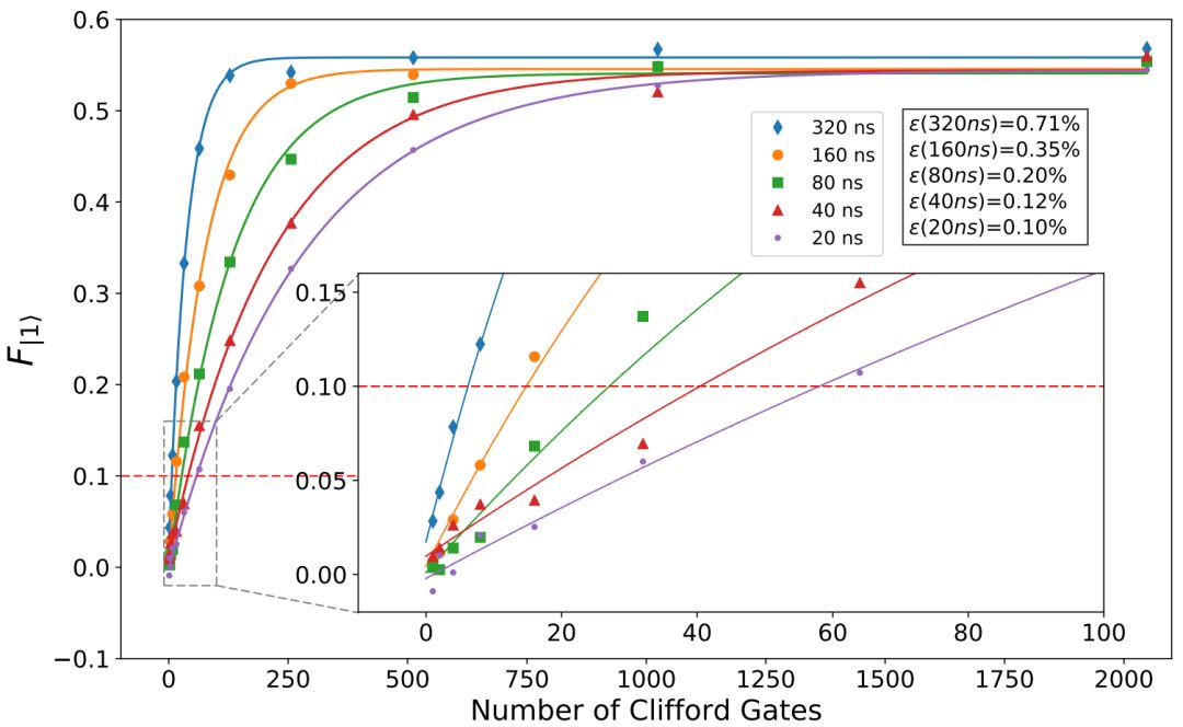 图 12:量子操作起始点之间不同的间隔时间对单量子比特随机化基准测试结果的影响。虚线标示了 10% 的错误率供参考。