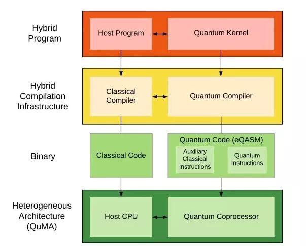 一个量子-经典混合程序包含一个主程序以及一个或多个量子核(quantum kernel),这些量子核可加速计算中的特定部分。主程序使用 Python 或 C++ 等经典编程语言描述,量子核使用 Scaffold 或 Q|SI> 等量子编程语言描述。混合编译基础架构会使用 GCC 等传统编译器将主程序编译成传统指令集代码,之后再由主 CPU 执行。
