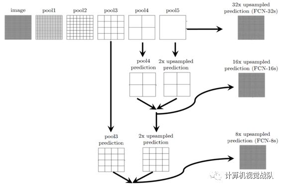跳层连接的作用就在于优化结果,因为如果将全卷积之后的结果直接上采样得到的结果是很粗糙的,所以作者将不同池化层的结果进行上采样之后来优化输出。具体结构如下: