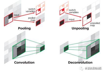 众所诸知,池化会缩小图片的尺寸,比如VGG16 五次池化后图片被缩小了32倍。为了得到和原图等大的分割图,我们需要上采样/反卷积。反卷积和卷积类似,都是相乘相加的运算。只不过后者是多对一,前者是一对多。而反卷积的前向和后向传播,只用颠倒卷积的前后向传播即可。所以无论优化还是后向传播算法都是没有问题。上池化的实现主要在于池化时记住输出值的位置,在上池化时再将这个值填回原来的位置,其他位置填0。图解如下: