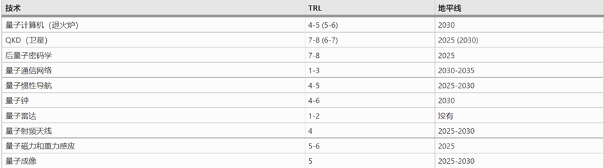 表 1 TRL 和时间范围预期。这些期望反映了一般 TRL 而不仅仅是军事 TRL。请注意,各种量子技术在同一应用程序中处于不同的 TRL
