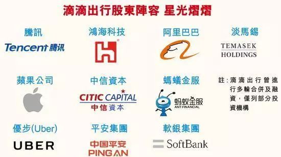 除了Uber,内地三大科网巨头‘BAT’百度、阿里巴巴、腾讯,以至活跃于风险投资的软银、鸿海和平安均是滴滴股东,尤见特别的是,美国苹果公司也在2016年入股10亿美元,为苹果在华最大单一科网投资。
