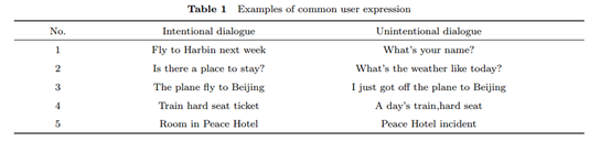 对于表1中前两组例子,直观上看,有出行意图和无出行意图的文本表达在用词、句式上存在较大的差异,可以直接使用一些模板匹配的方式进行识别。但是在聊天语料中处理过程中发现,由于聊天系统对话的特殊性,用户的表达一般较短,一些无意图的用户聊天文本在用词,句式上和有意图文本比较接近,通过一些模板或者关键词特征的方法不容易区分。 从表1中的第3到第5组例子可以看出,每一组的两句对话在用词或者句式上都具有很高的相似性,但却属于两类不同的意图领域。 对于第3组例子,尽管二者都具有相同的“动词+地点”的动宾关系句法结构,并且都包含了“飞机”这一关键词,但是有意图文本希望查询到某地的航班信息,而无意图文本则是表达了用户刚刚下飞机;对于第4组例子,有意图对话表达想去北京要订火车票,而无意图表达只是表示自己坐了一天的火车;对于第5组例子,有意图文本很短,只有三个词语,但是却包含了“酒店”,“大床房”等关键词,无意图文本虽然也包含了关键词,但是表达的却是一个新闻事件,并不是希望订酒店。