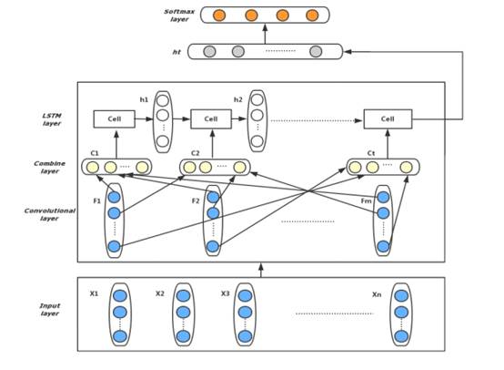 CNN可以从文本中获取深层的特征信息,LSTM则可以对文本的时序关系建模. 为了充分利用二者的优点,本文将CNN与LSTM模型进行整合,使用基于Convolutional-LSTM的出行消费意图识别模型,该模型于2015 年由Sainath等人提出[8],并在语音、图像领域有了一些应用[9-12],结构如图4所示,包含了输入层,卷积层,特征组合层,长短期记忆层以及最终的Softmax层。本文将该模型应用在文本上,其卷积过程与前人工作不同的是,卷积核的宽度和词向量维度相同。本任务中该模型的输入层,卷积层,Softmax层结构和CNN中对应层结构相同,长短期记忆层与LSTM中对应层结构相同。特征组合层的每个向量通过将卷积后的每个feature map的第i维对应的元素顺序相连得到,得到n-h+1个组合向量,这样每个向量根据卷积的先后顺序进行重新组合,保证了文本的时序性。进而将向量依次送入LSTM的Cell中。得到最后一个隐层的输出作为最终的句子表示,交由Softmax层得到识别结果。