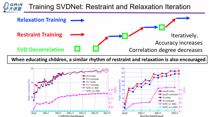 有了SVD去相关过程后,额外设计了一个训练步骤,叫做张弛迭代法。在紧张训练时,性能表现提升,在松弛训练阶段下性能不变,甚至略微降低。但总体的趋势是上升。