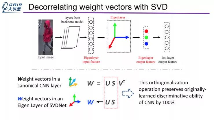 来自清华大学信息认知与智能系统研究所的孙奕帆同学在ICCV 2017中一篇spotlight论文《SVDNet forPedestrian Retrieval》。这篇论文将全连接层权矩阵解读为特征空间中的一组投影基或是一组模板,联合奇异值分解(SVD)优化深度特征学习过程,取得了显著的性能提升,并揭示了非常有趣的机理现象。