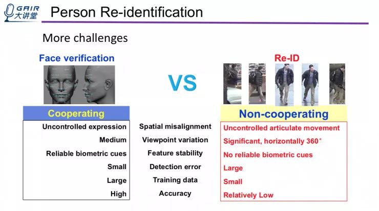 人脸识别和行人再检测最大的区别是行人再识别是工作在非合作状态下,也就是说所采集的行人不需要配合你做一些动作。而人脸识别最早是工作在合作状态下,虽然现在随着技术的发展,人脸验证可以做到半合作状态,但是大部分情况下都不是完全非合作。由于行人图像相对难标注,获得的训练数据也是相对较少,以及一些别的原因,目前人脸识别的准确率要高一点。