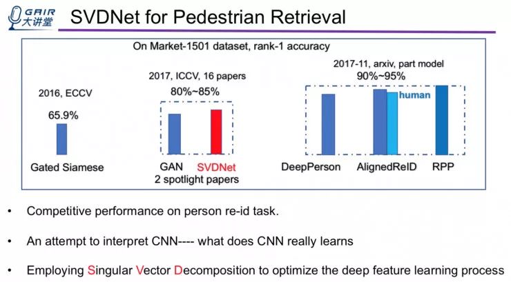2017年,行人再识别研究飞速进展。例如,在公开数据集Market-1501上,一选正确率从2016年ECCV中较高的65.9%提高到2017年ICCV中的80+%,arXiv近期一些paper更是将该指标刷新到95%左右。