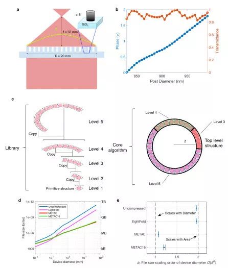 She 说:“因为纳米结构如此小,每个透镜中的信息密度极高。如果你将100微米的透镜变成厘米级的透镜,那么描述透镜所需的信息将增加1万倍。每当我们尝试去扩大透镜尺寸时,设计文件的大小将膨胀至吉字节级甚至太字节级。”