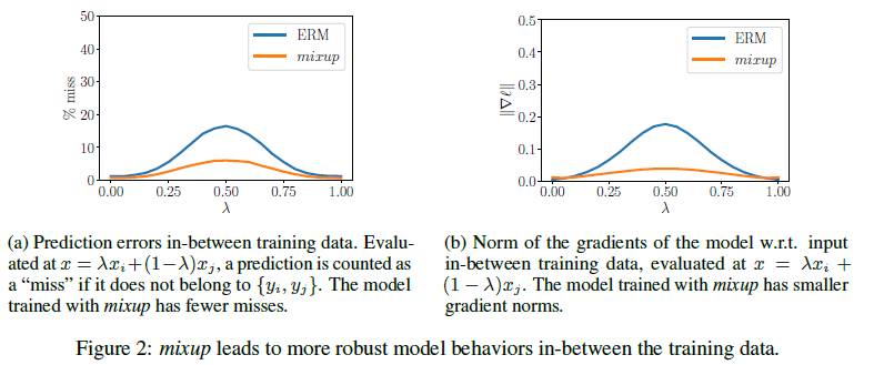 mixup究竟做了什么?mixup邻域分布可以被理解为一种数据增强方式,它令模型在处理样本和样本之间的区域时表现为线性。我们认为,这种线性建模减少了在预测训练样本以外的数据时的不适应性。从奥卡姆剃刀的原理出发,线性是一个很好的归纳偏见,因为它是最简单的可能的几种行为之一。图1显示了mixup导致决策边界从一个类到另一个类线性的转变,提供了一个更平滑的不确定性估计。图2显示了在CIFAR-10数据集上用mixup和ERM两个方法训练的两个神经网络模型的平均表现。两个模型有相同的结构,使用相同的训练过程,在同一个从训练数据里随机抽样而来的样本上来评估。用mixup训练的模型在预测训练数据之间的数据时更稳定。