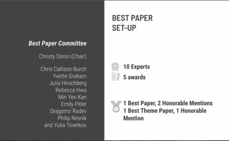 最佳主题论文:《Climbing towards NLU: On Meaning, Form, and Understanding in the Age of Data》(迈向NLU:关于数据时代的意义,形式和理解)