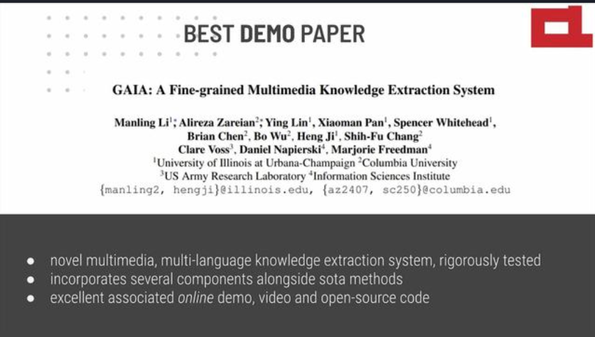 最佳DEMO论文:《GAIA: A Fine-grained Multimedia Knowledge Extraction System》(GAIA: 细粒度多媒体知识提取系统)