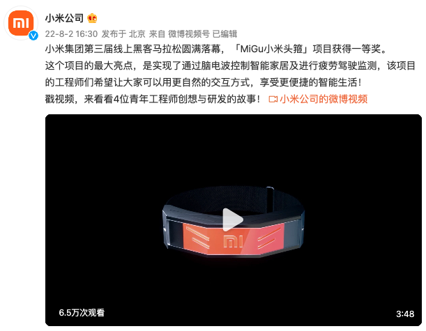 近日,小米公司在官微发布了一则视频(https://weibo.com/1771925961/LF8RNFREW)表示,“小米集团第三届线上黑客马拉松圆满落幕,「MiGu小米头箍」项目获得一等奖。”