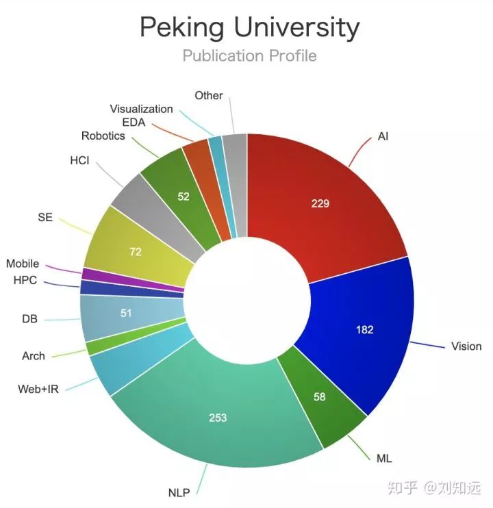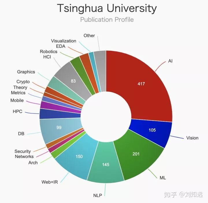 总之,我认为CSRankings是很好地定量了解各高校CS各领域研究实力和师资力量的平台,例如下面就是CSRankings提供的清北两校不同领域发表论文分布的饼状图。