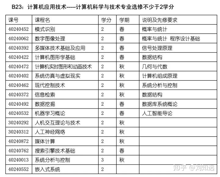 所以,回到这个问题,人工智能学什么?建议就是以计算机核心课程(数学基础课、学科基础课)为学科主线,以 机器学习、知识表示、计算机视觉、自然语言处理 为学科特色,以学科交叉为辅助。因此,我们也可以说,无论是在以南京大学人工智能学院为代表的新成立的人工智能专业,还是以清华大学计算机系为代表的计算机专业,都可以完成对人工智能基础知识的学习。不同之处在于,前者预置为学科基础课,后者则成为高年级时的可选方向(计算机系统结构、计算机软件与理论、计算机应用技术)之一的计算机应用技术,如下是该方向的专业限选课程列表,其中超过一半课程是AI相关。