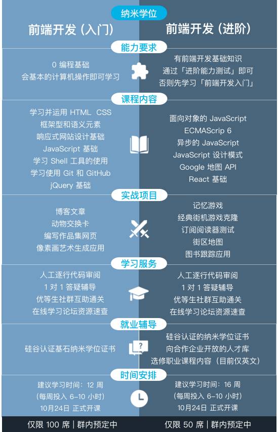 新一期课程将于 10月24日 正式开课,本期中国区仅开放 150 个席位,并限时免费开放了硅谷教室,可以免费体验前端课程,提前预定席位!