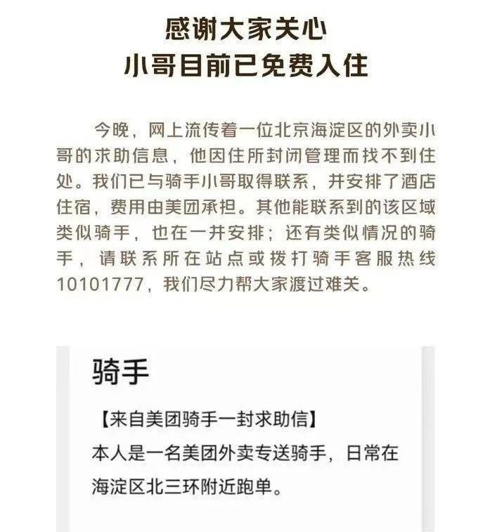【北京外卖员怕封控“流浪”3天发文求助?美团回应】11月22日晚,北京海淀区一名外卖小哥的求助信息在社交平台上广泛流传,该骑手表示,因为住所封闭管理而连续几天找不到住处。记者从美团获悉,平台方已经在当晚与骑手小哥取得联系,并安排了酒店住宿,费用由平台承担。其他能联系到的该区域骑手,也在一并安排。美团方面表示,如果还有类似情况的骑手,可以联系所在站点或拨打骑手客服热线,平台将尽力帮大家渡过难关。(北京日报)