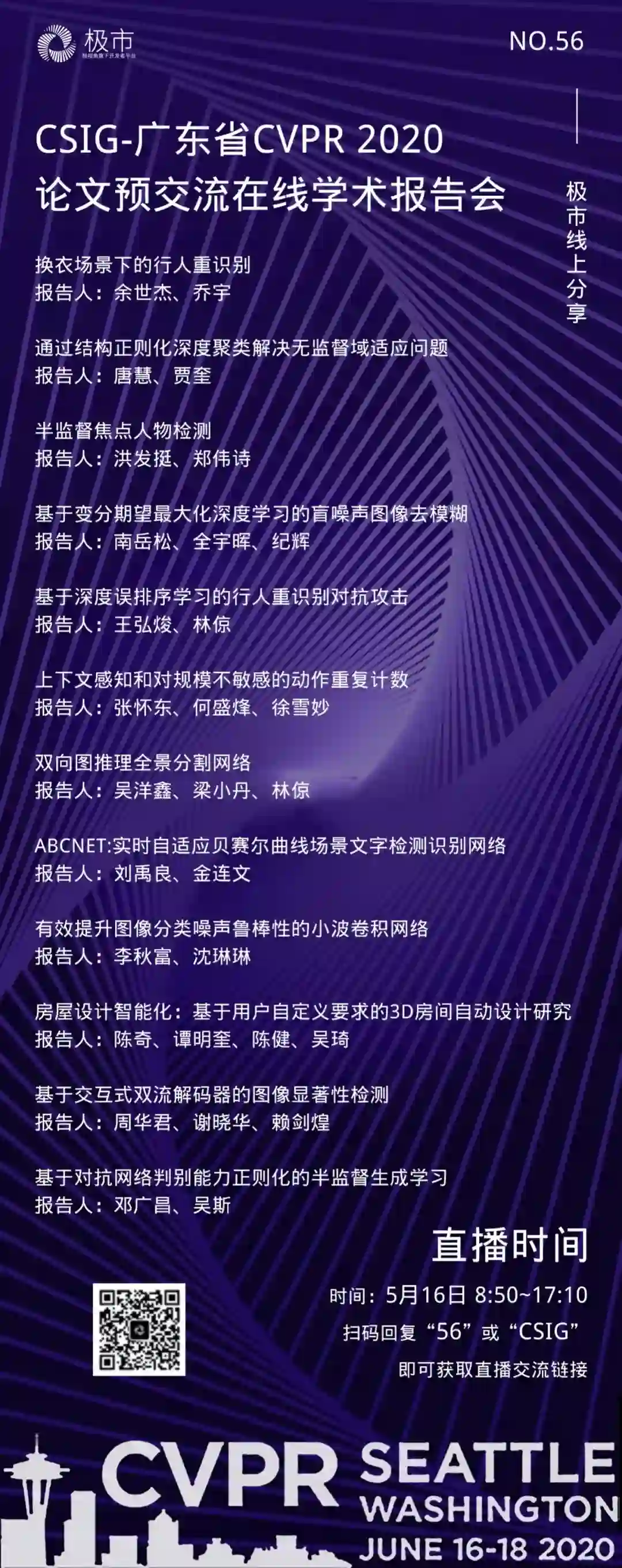 就在明天,由金连文、郑伟诗教授主持的CSIG-广东省CVPR 2020论文预交流在线学术报告会将在极市平台独家直播:5月16日08:50~17:10,超硬核的12位CVPR2020论文一作汇报分享,涵盖分类/分割/ReID等多个热门方向,详情戳这里,在极市平台后台回复“56”,即可获取直播链接。