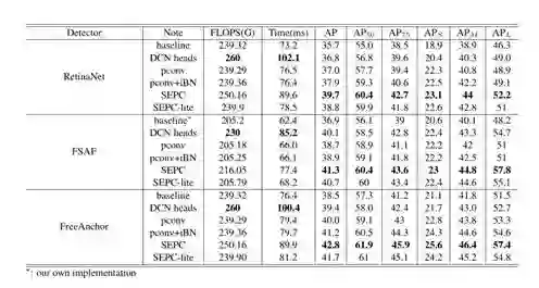 可以看到,我们提出的模块在三个model上均有稳定的提升,并且性能提升相比flops与forward速度的增加极具性价比,值得注意的是,虽然我们使用了Dconv,但是性能的提升不仅仅是Dconv带来的,相比head结构全部更换为Dconv,我们的SEPC在速度与性能上都体现出了绝对的优势。