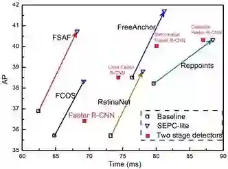 我们SEPC在mAP45左右的baseline上依然有接近3mAP的提升,我们在甚至在单尺度测试的条件下得到了一个mAP为50.1的单阶段检测器。