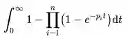 NIntegrate[1-Fold[Times,1,1-E^(-#t)&/@p],{t,0,9527}]