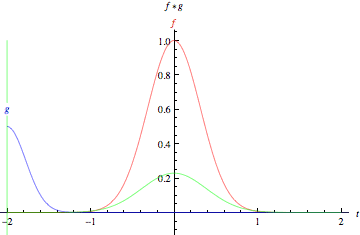 取自:Mathworld. "The green curve shows the convolution of the blue and red curves as a function of t, the position indicated by the vertical green line. The gray region indicates the product g(tau)f(t-tau) as a function of t, so its area as a function of t is precisely the convolution."
