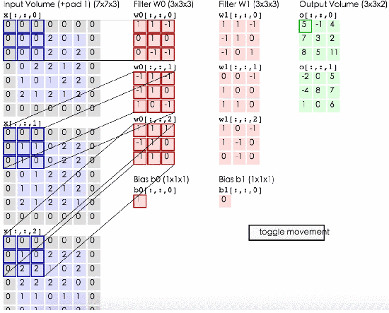我们以输入量和输出量来描述经过卷积网络处理的图像,在数学中以多维矩阵表示为:30x30x3。每一层的维度会发生变化,原因详见下文。
